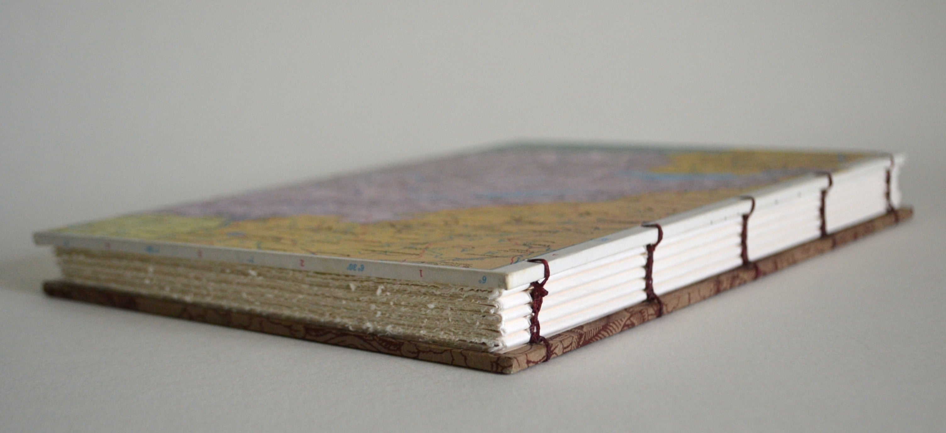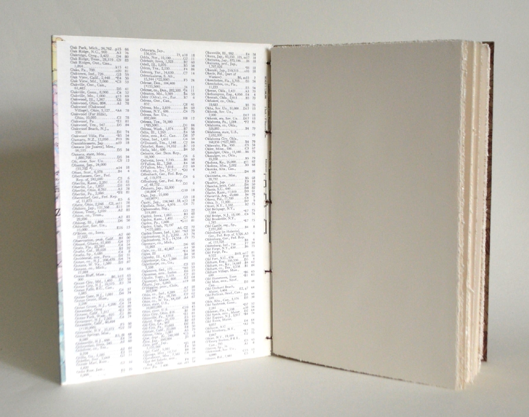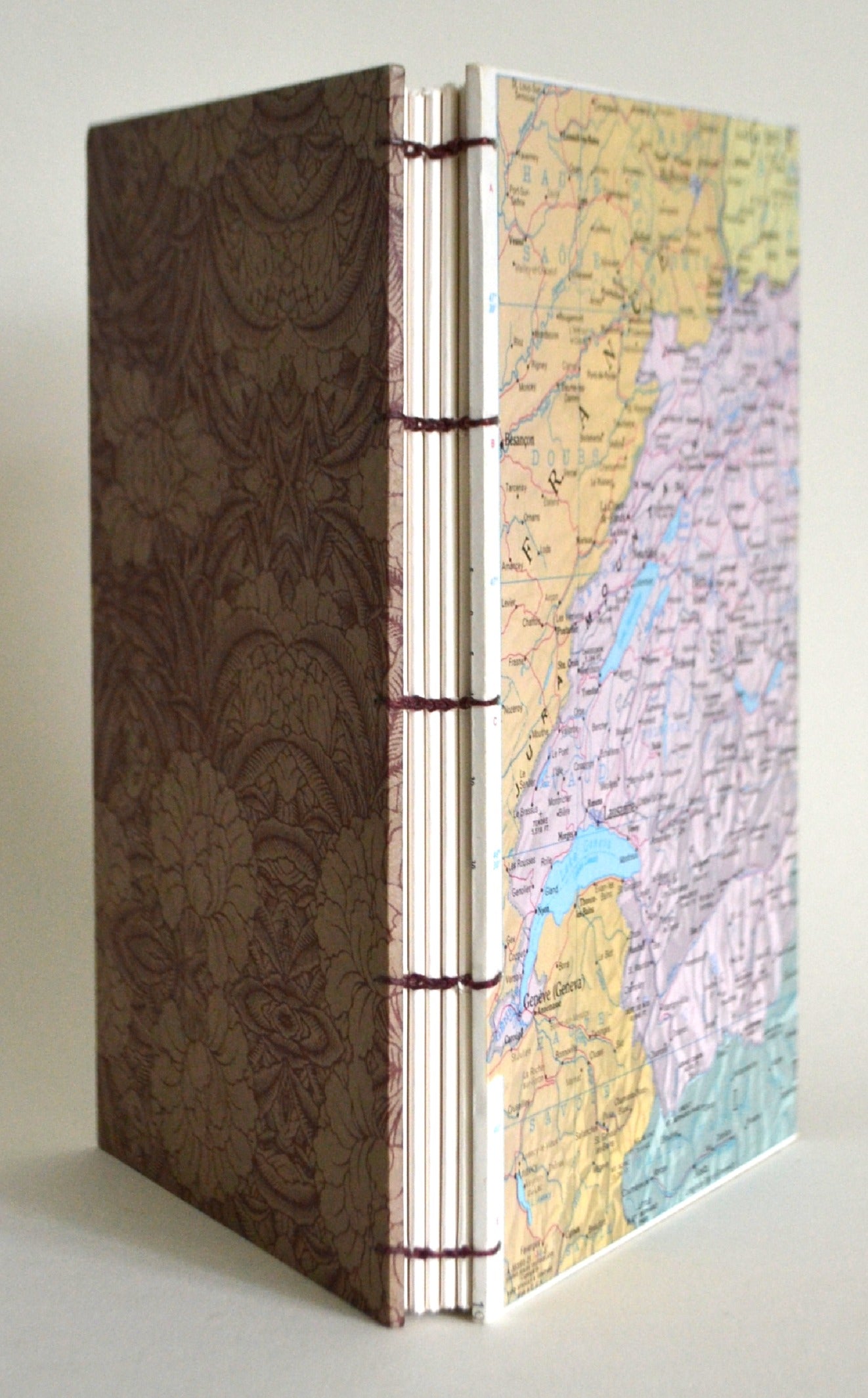 This unique blank book is covered in a vintage map of Central Europe (featuring the Alpine region). Exquisite Nepalese lokta paper adorns the back cover. Inside, the end papers are repurposed pages from actual atlases.