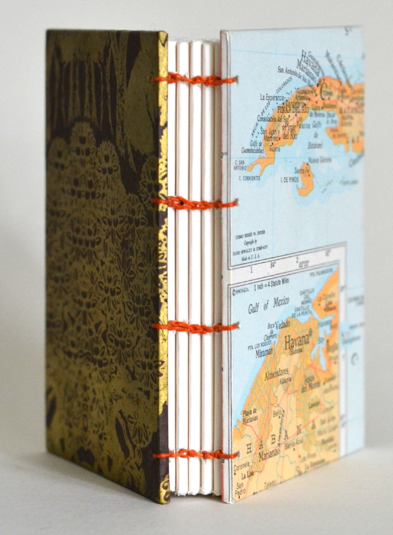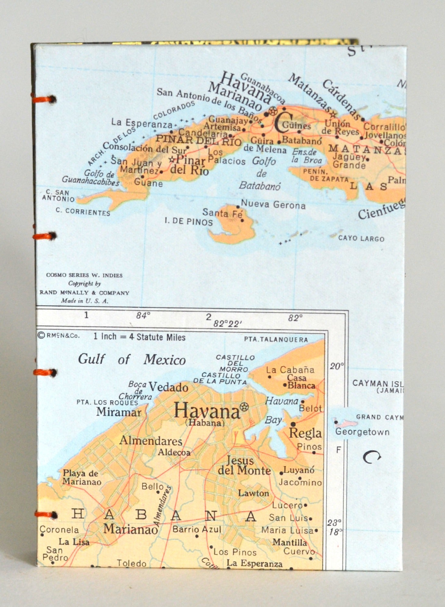 This unique blank book is covered in a vintage map of Cuba, featuring Havana. Exquisite Nepalese lokta paper adorns the back cover. Inside, the end papers are repurposed pages from actual atlases.