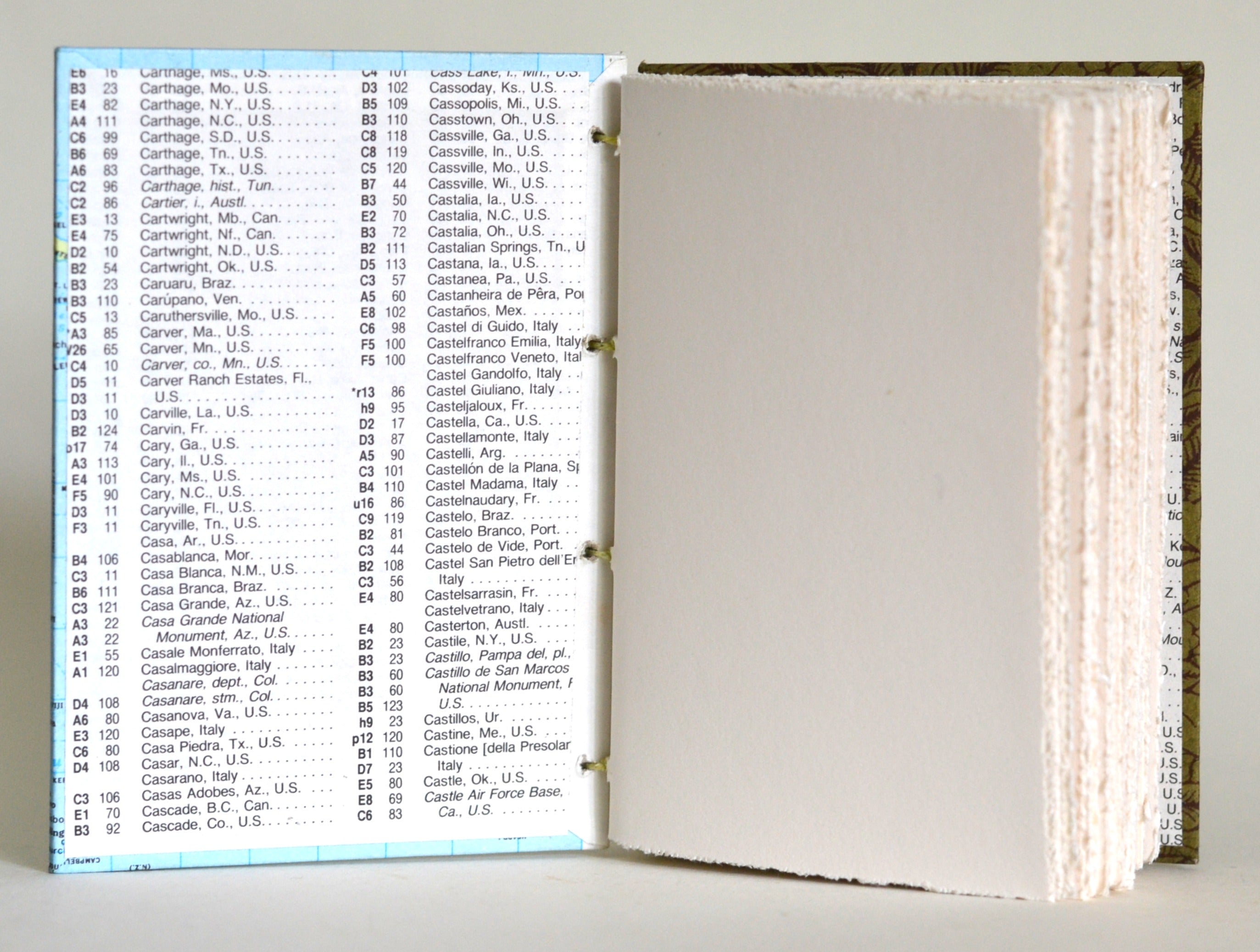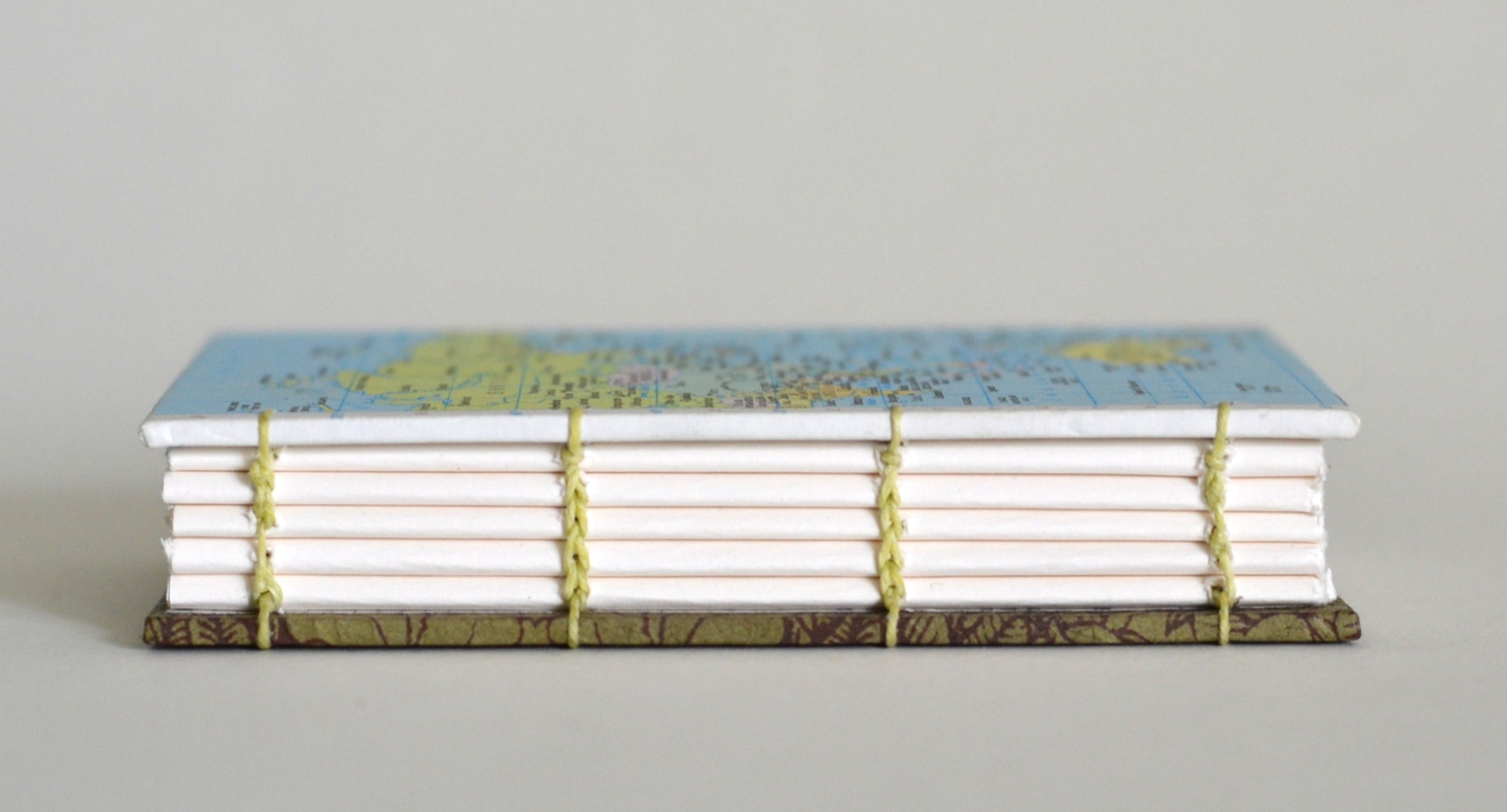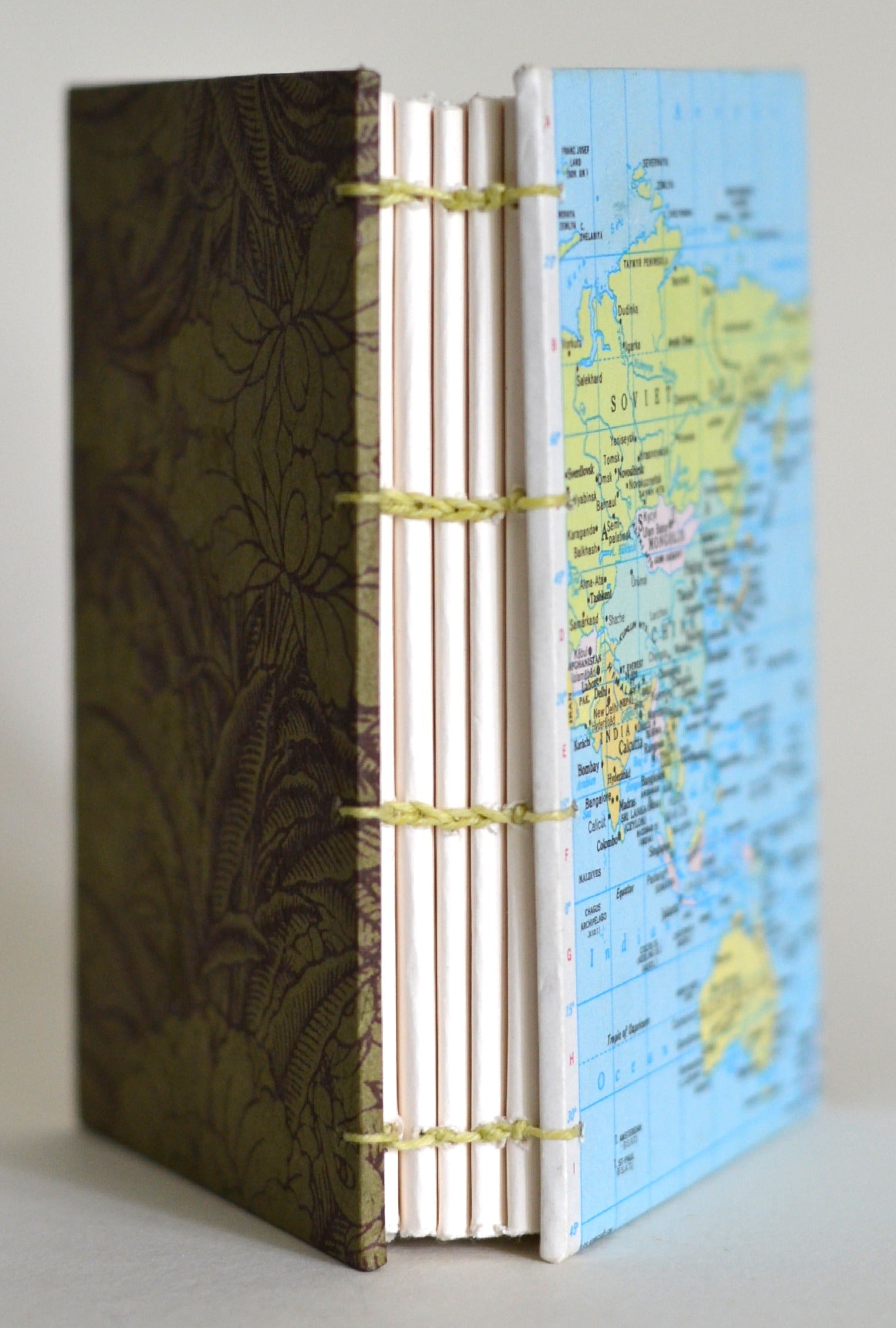 This unique blank book is covered in a vintage map of Asia and Oceania. Exquisite Nepalese lokta paper adorns the back cover. Inside, the end papers are repurposed pages from actual atlases.