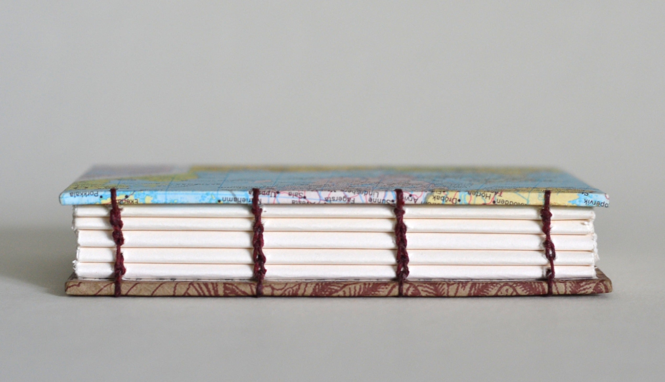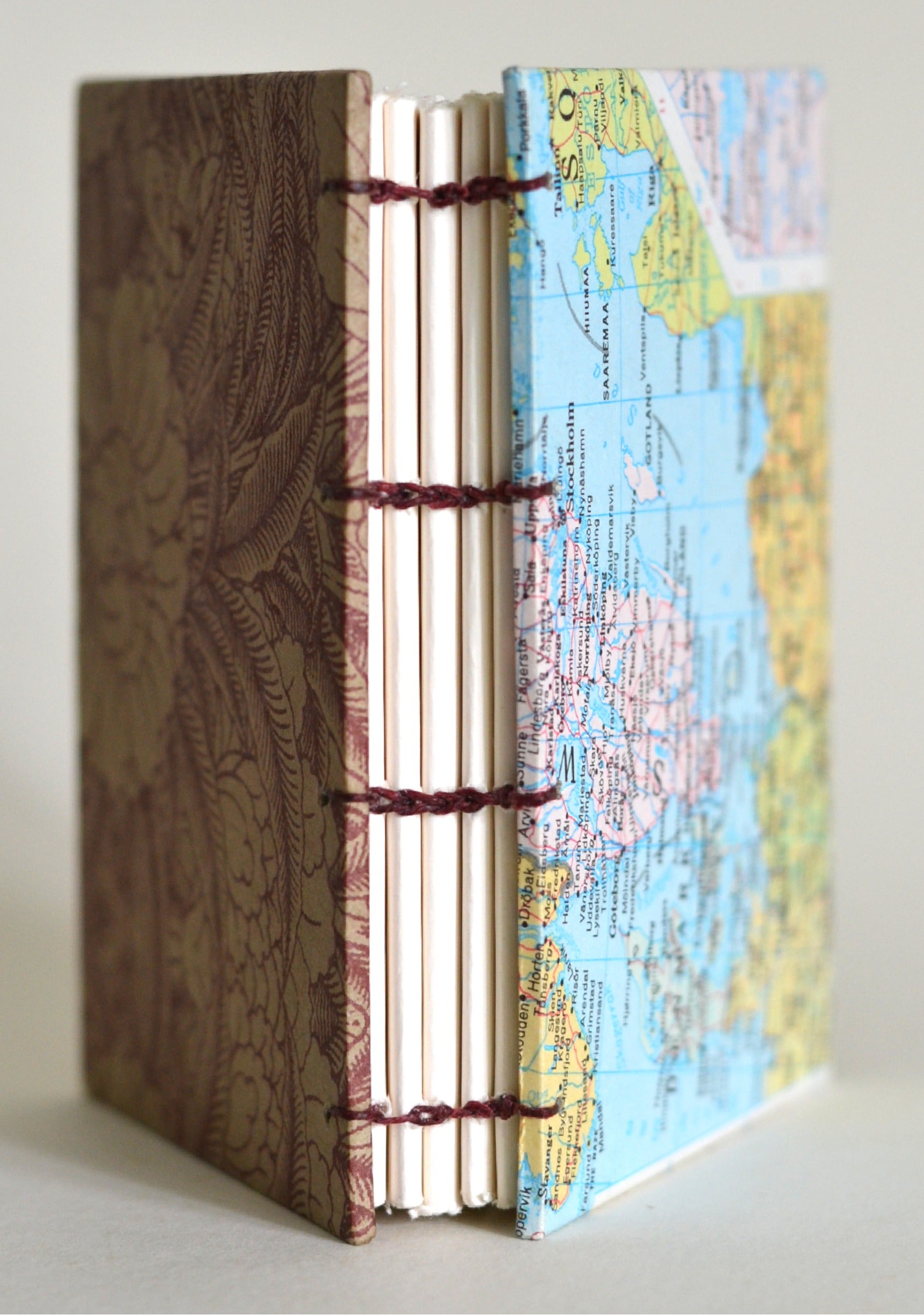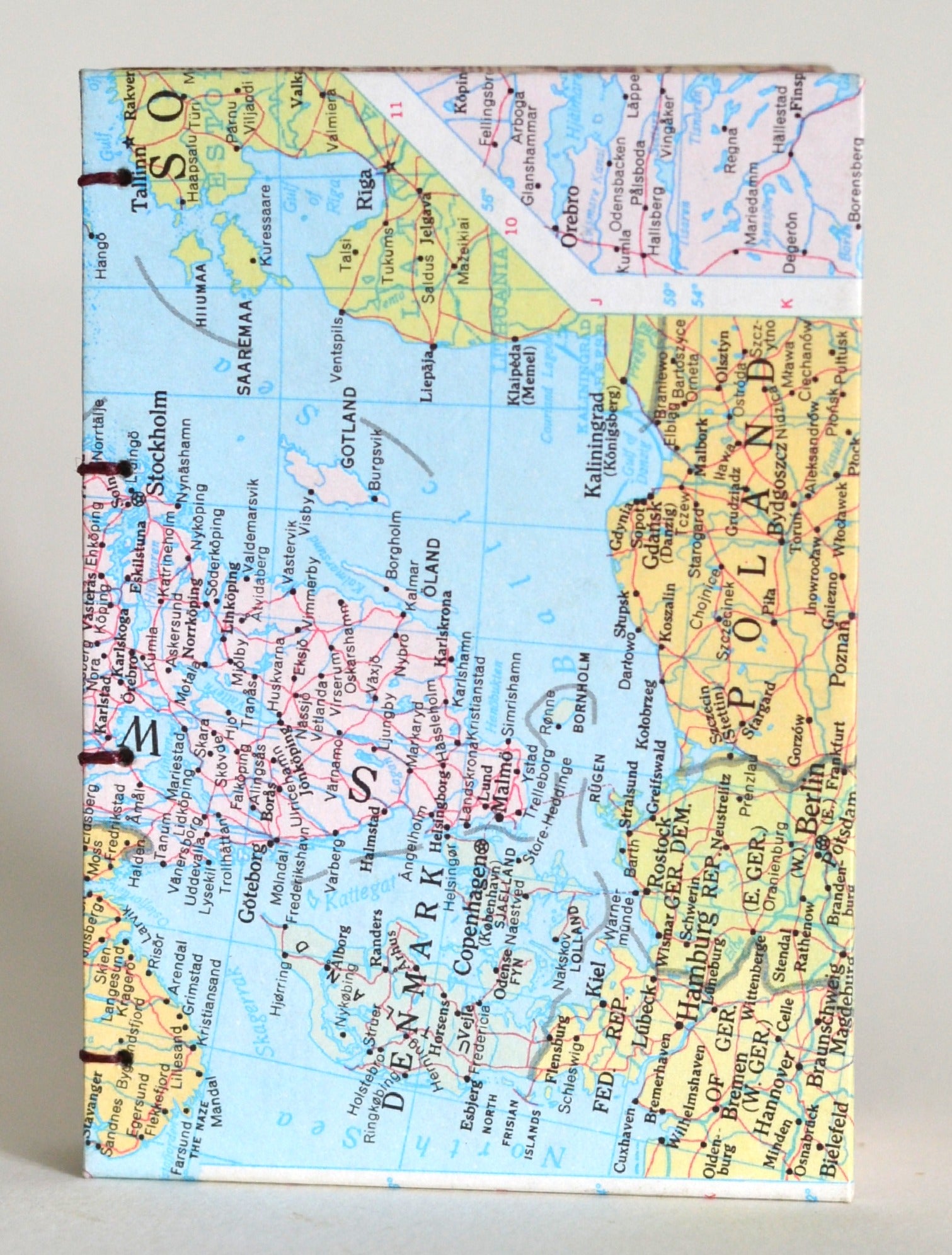 This unique blank book is covered in a vintage map of the Baltic Sea, featuring Northern Europe. Exquisite Nepalese lokta paper adorns the back cover. Inside, the end papers are repurposed pages from actual atlases.