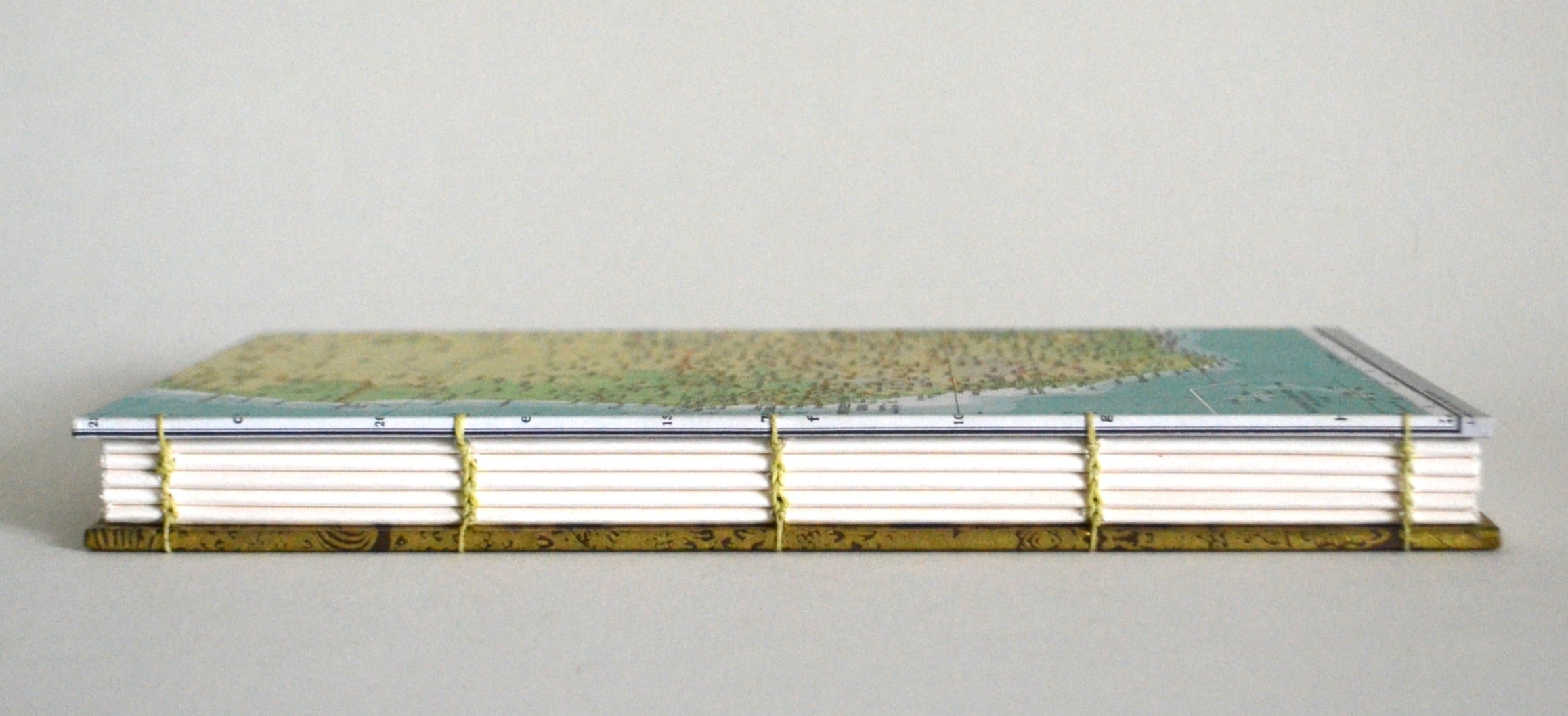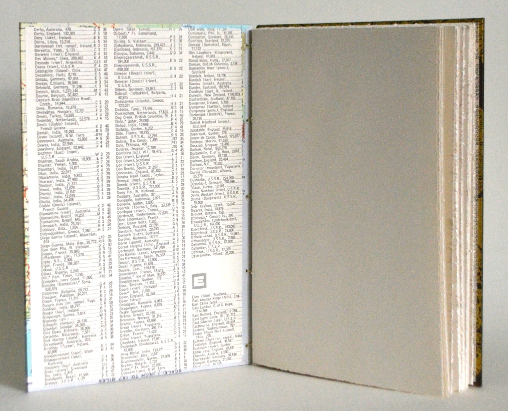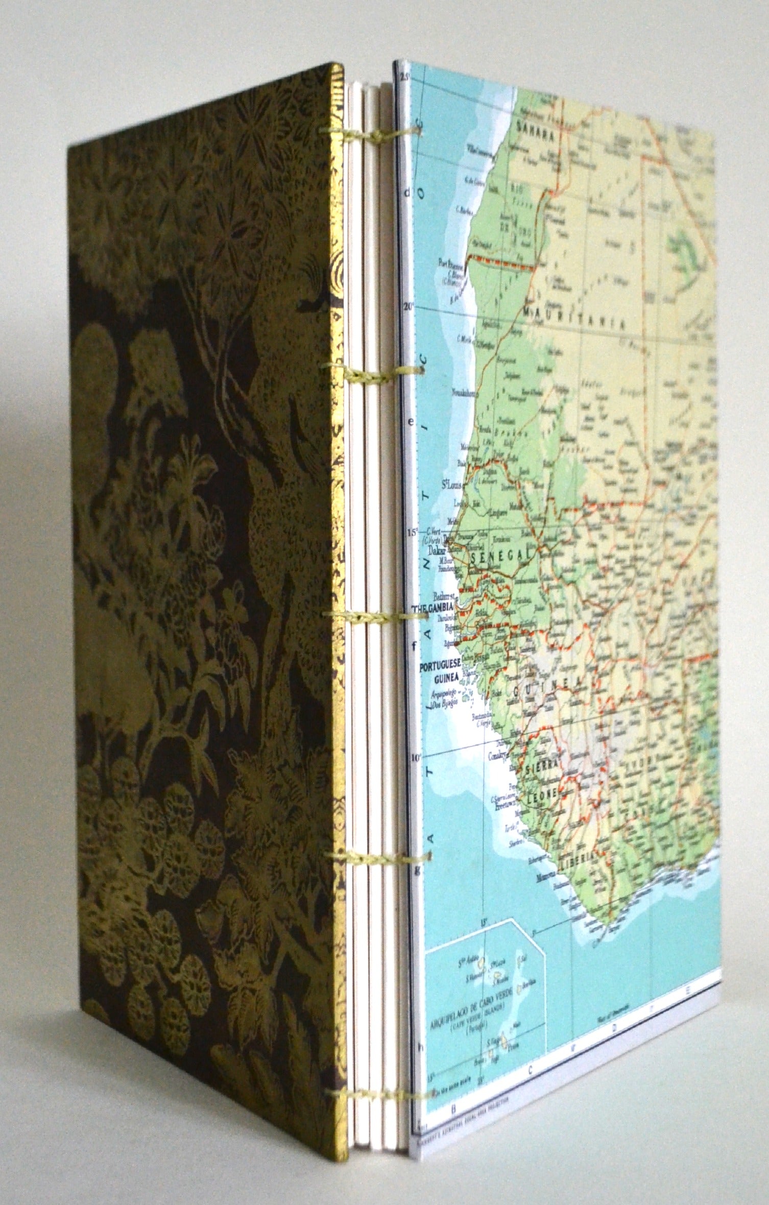 This unique blank book is covered in a vintage map of Western Africa. Exquisite Nepalese lokta paper adorns the back cover. Inside, the end papers are repurposed pages from actual atlases.