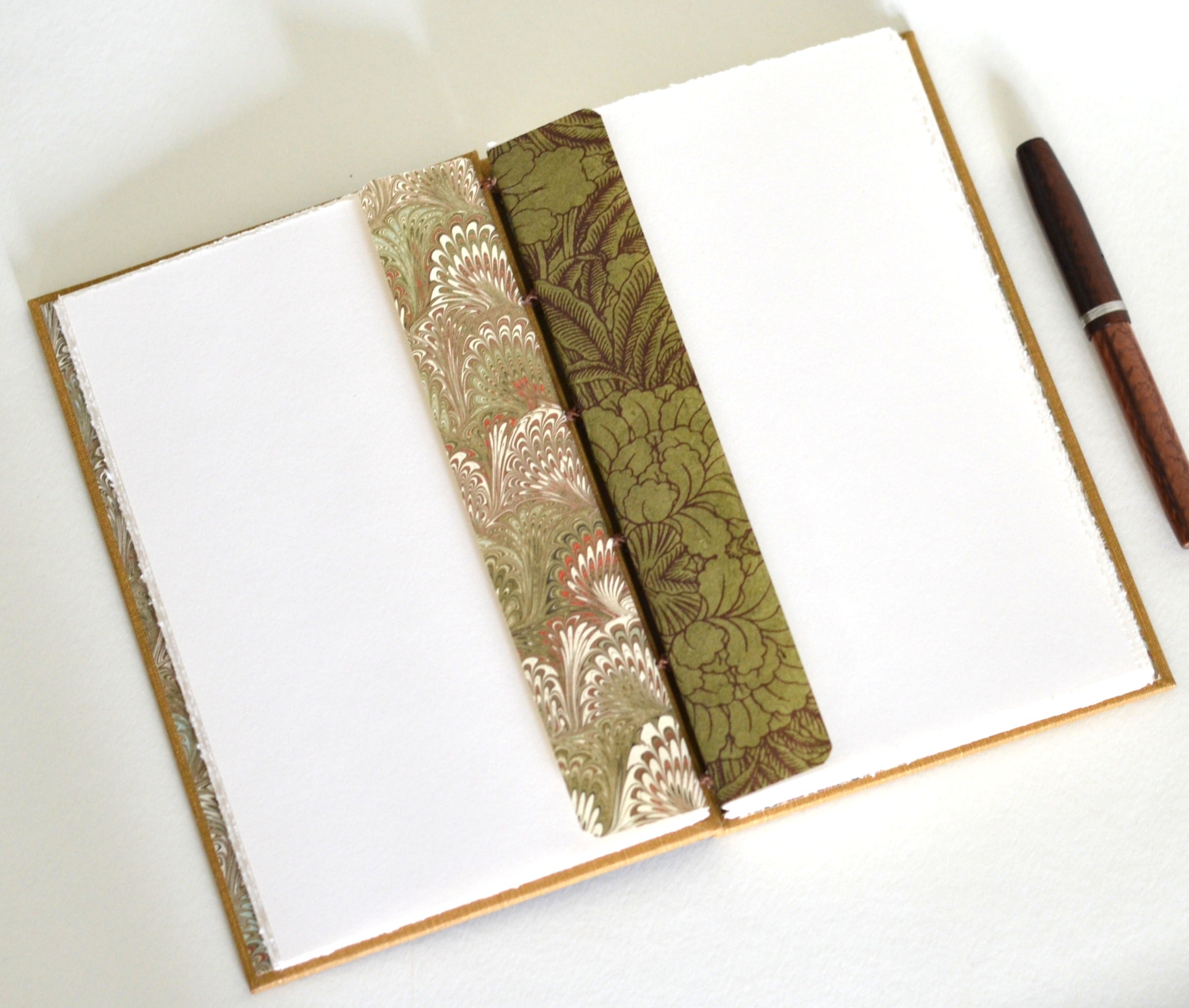 This one-of-a-kind blank book has been created from an actual vintage novel. The dense blank paper is thick enough for some art pens and fountain pen ink. The hand-ripping of each page gives a deckled-edge quality. Each bundle of pages is carefully adorned with stunning decorative paper—hand marbled and Nepalese lokta.
