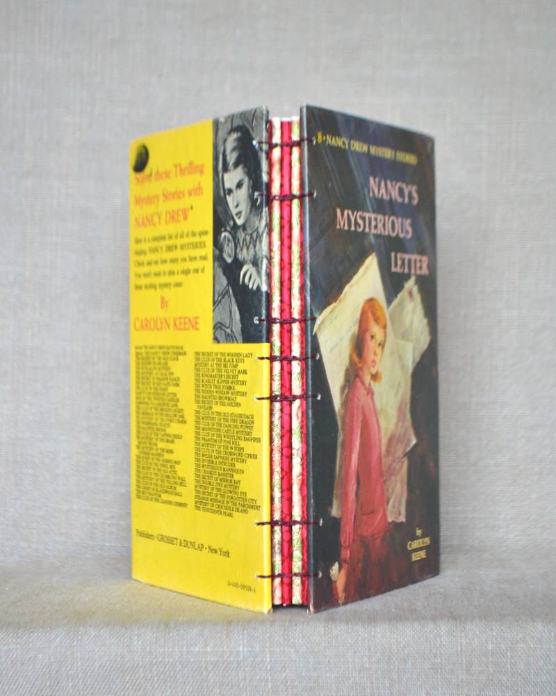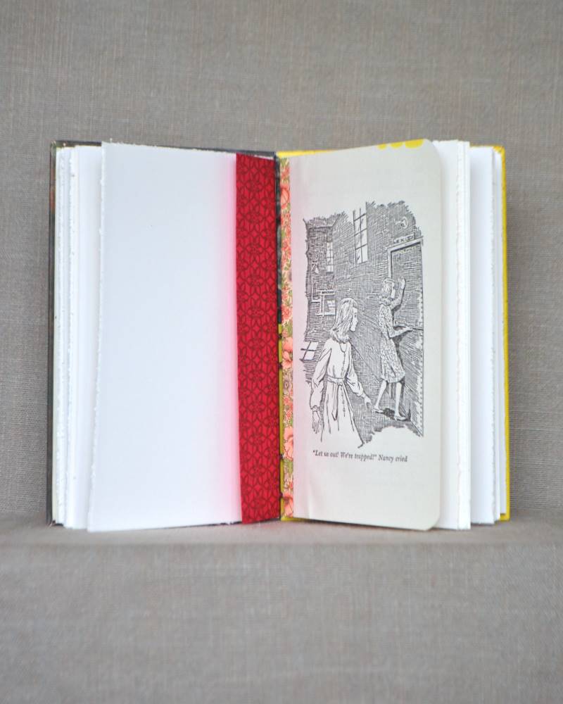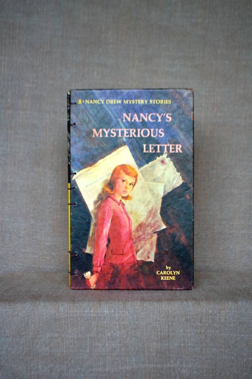 Who doesn't love Nancy Drew? This one-of-a-kind and once-complete novel has been transformed into a blank book. The dense blank paper is thick enough for some art pens and fountain pen ink. The hand-ripping of each page gives a deckled edge quality. Each bundle of pages is adorned actual pages from the original book.