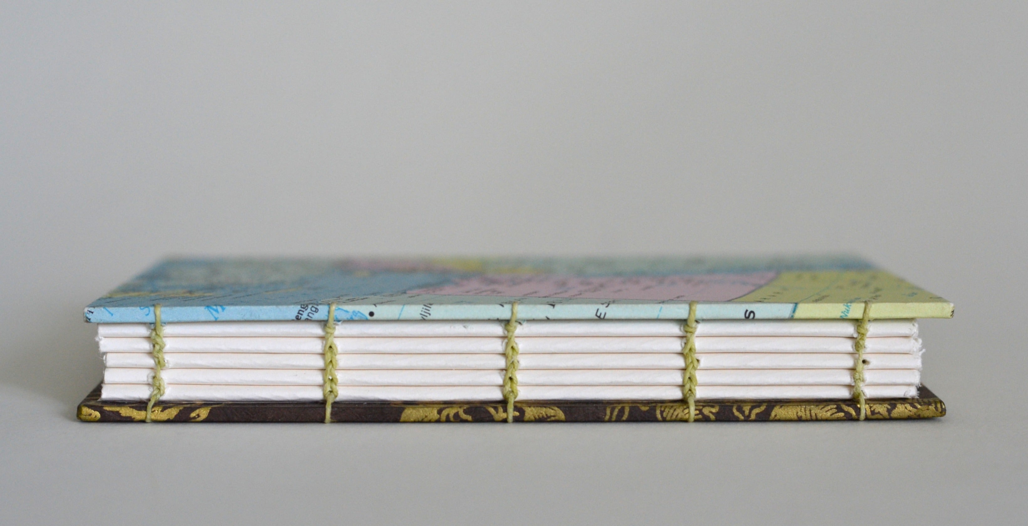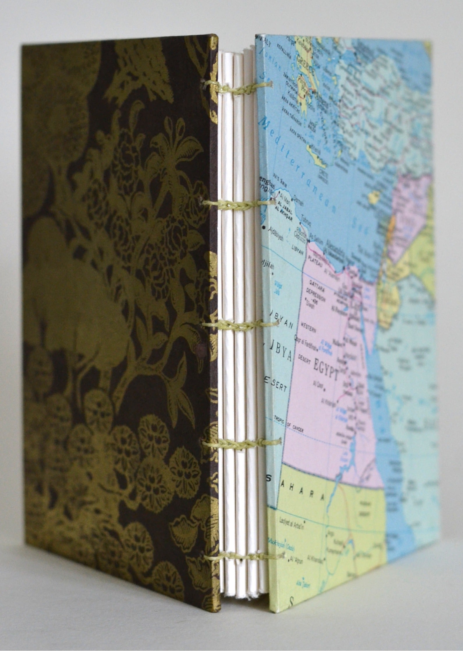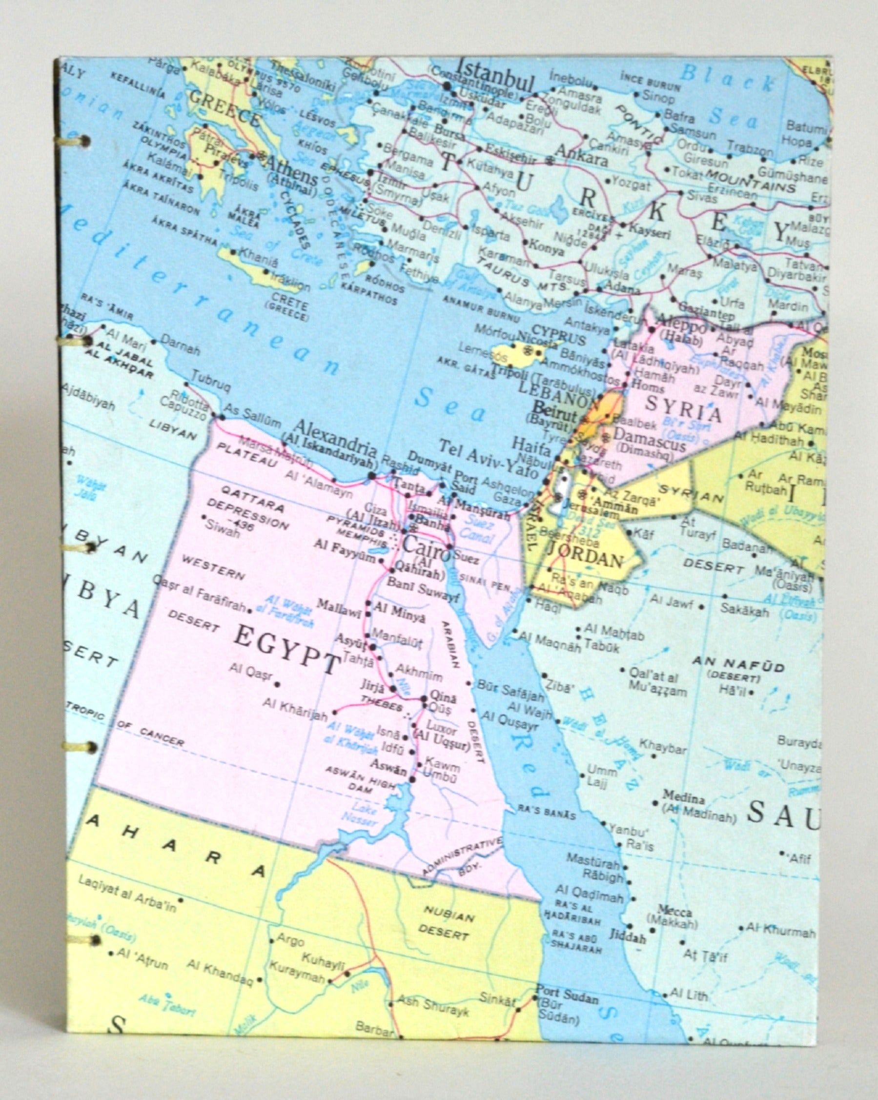This unique blank book is covered in a vintage map of the Middle East. Exquisite Nepalese lokta paper adorns the back cover. Inside, the end papers are repurposed pages from actual atlases.